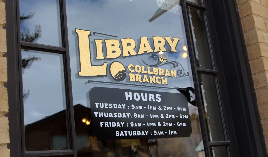 Working with the Town of Collbran (Stockmen Bank building owners), we were able to get approval to add a window signage to building to help identify the building as a library, and prominently display library hours.